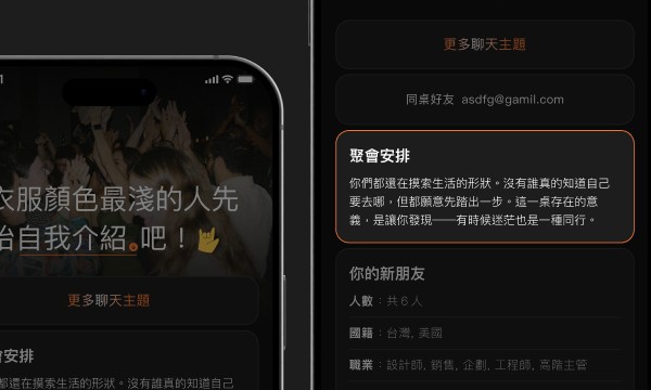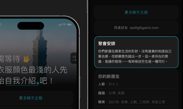 我們幫你把現場的陌生人透過個性分析配對分組,變成更容易開口、更容易聊下去、也更可能產生後續連結的人
